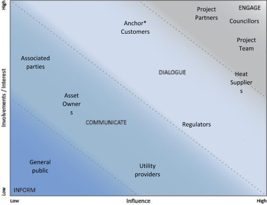 Figure 1 identifies and positions typical stakeholders in a heat pump project, with respect to their influence and likely level of involvement. Depending on where stakeholders are located, different levels and types of communication and engagement are recommended.
